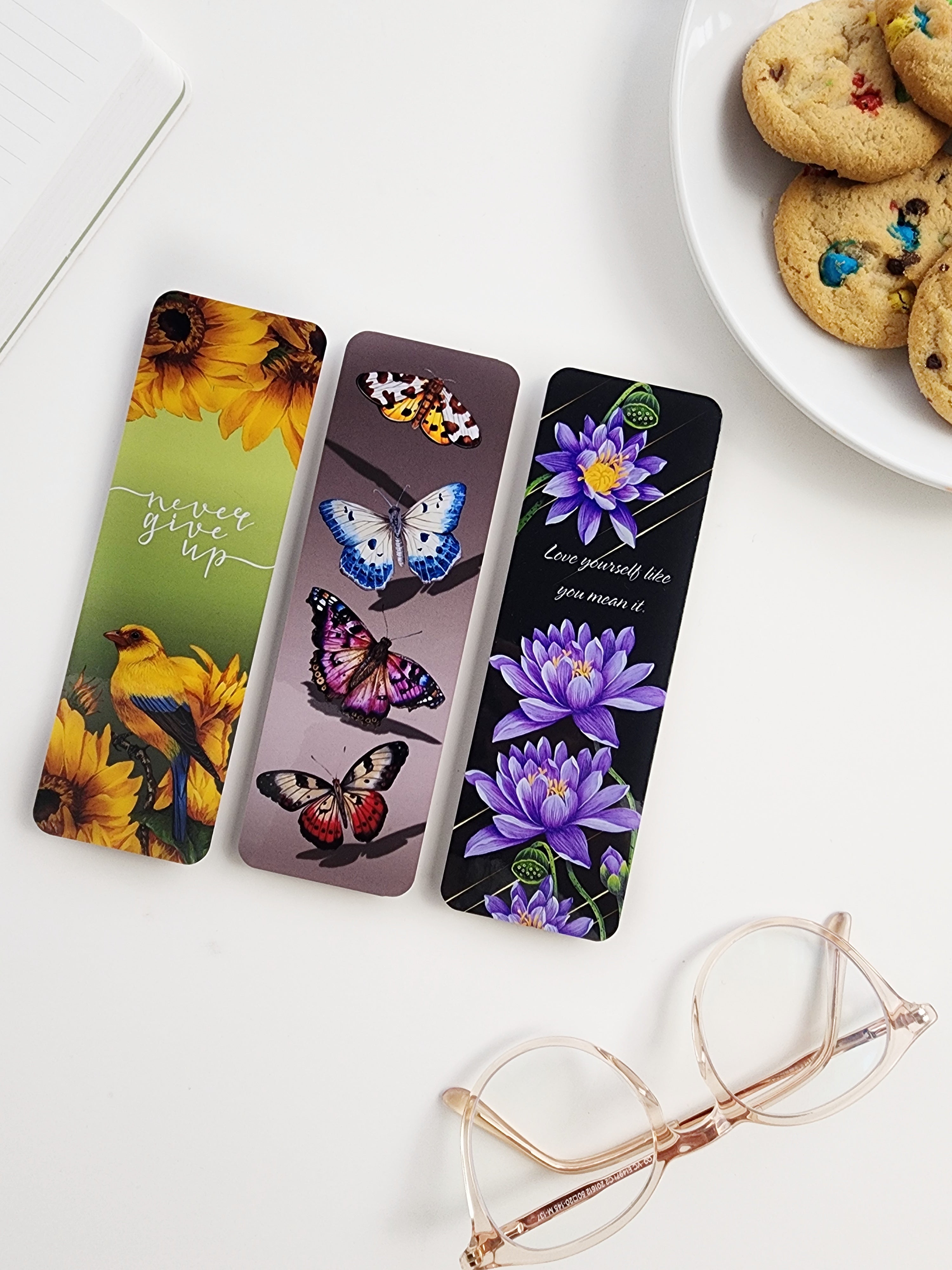 Each fine-art bookmark set features three coordinated designs printed on high-quality paper and finished with a clear, protective lamination.
